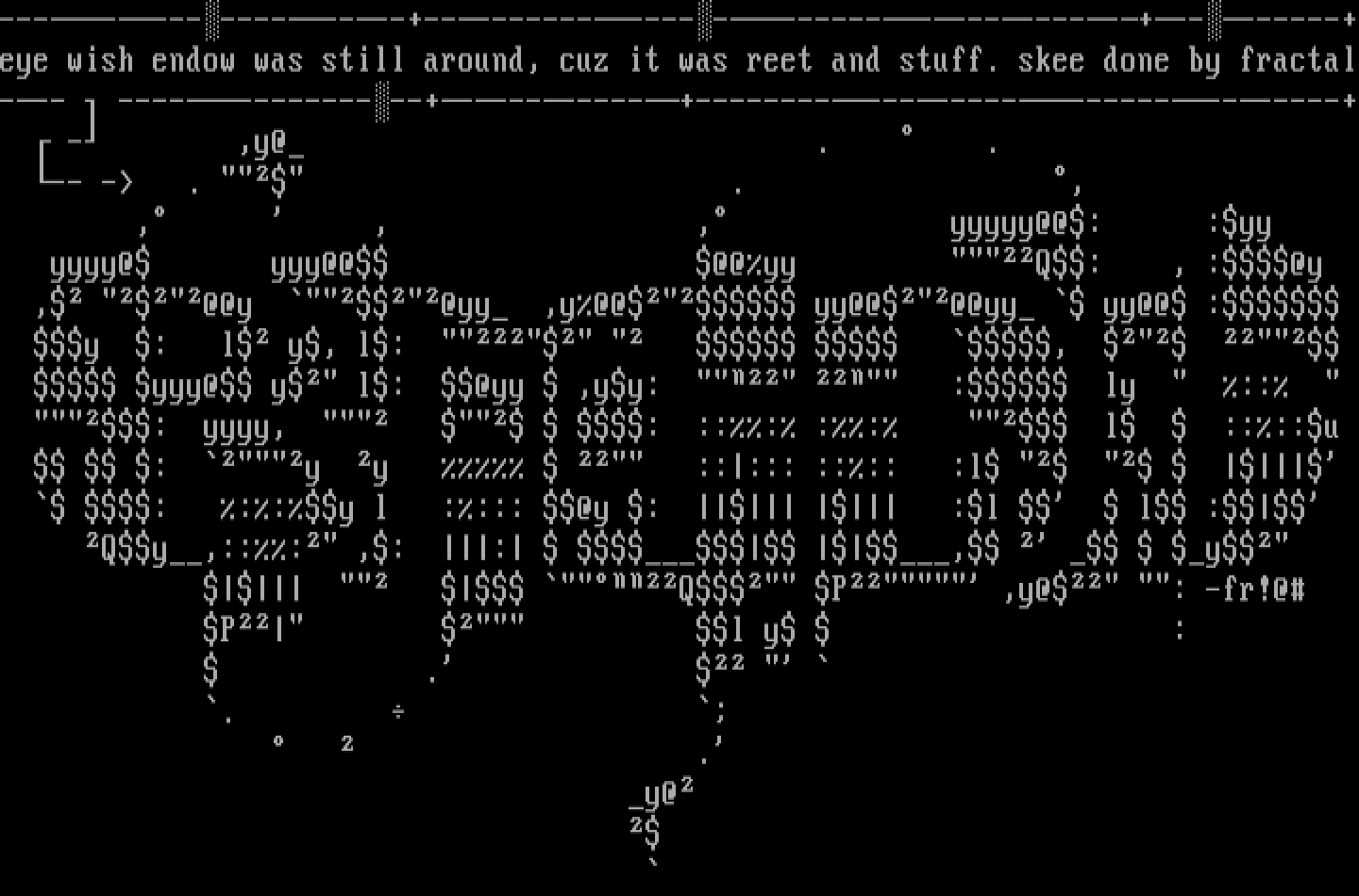 ---------------+-----------------------------+--------+eye wish endow was still around, cuz it was reet and stuff. skee done by fractal--- --------------+---------+-----------------------------+ - ,y@ . .