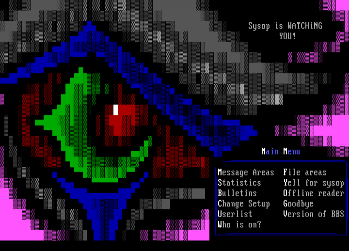 Main Menu Message Areas File areas Statistics Yell for sysop Bulletins Offline reader Change Setup Goodbye Userlist Version of BBS Who is on?