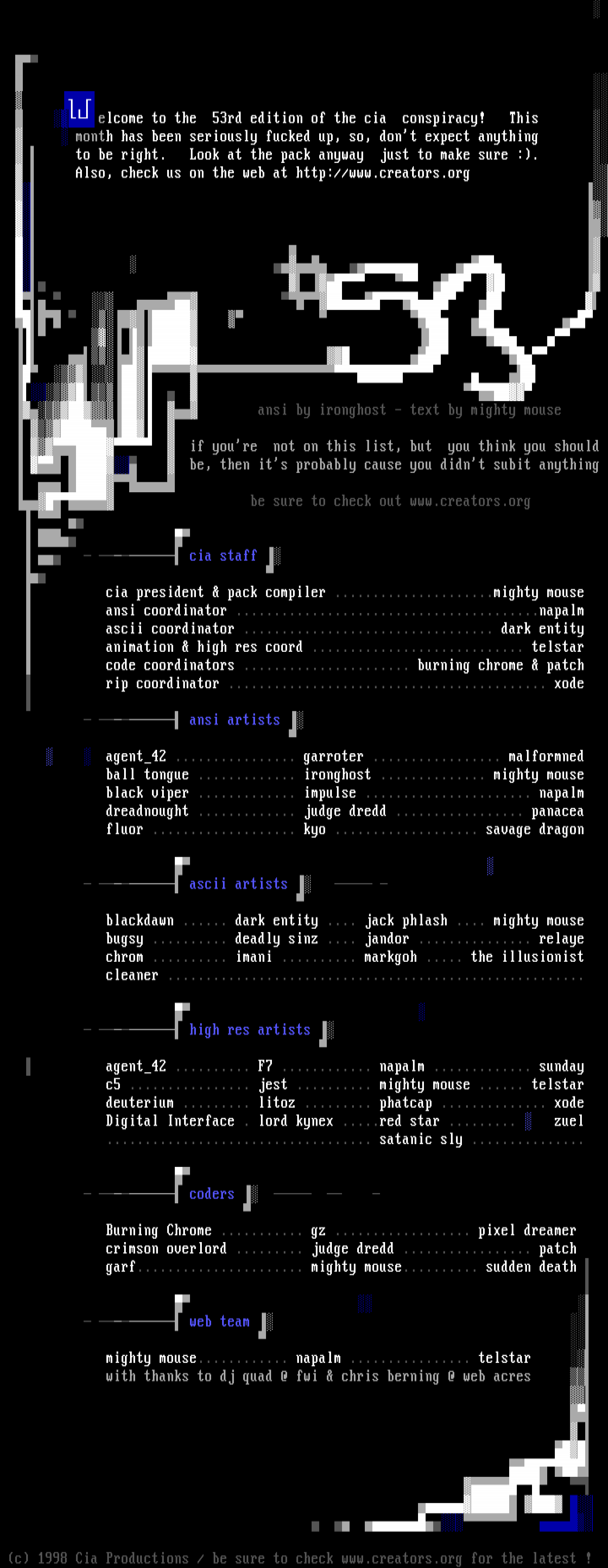 elcome to the 53rd edition of the cia conspiracy! This month has been seriously fucked up, so, dont expect anything to be right. Look at the pack anyway just to make sure :. Also, check us on the web at http://www.creators.org
