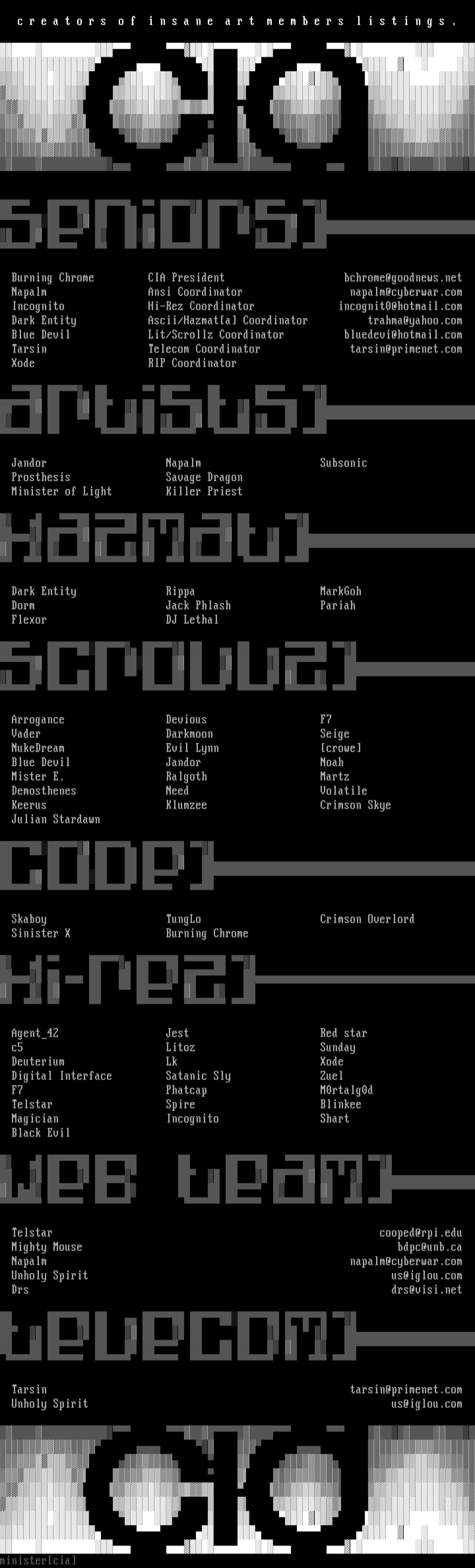 Burning Chrome CIA President bchrome@goodnews.net Napalm Ansi Coordinator napalm@cyberwar.com Incognito Hi-Rez Coordinator incognit0@hotmail.com Dark Entity Ascii/Hazmata Coordinator trahma@yahoo.com Blue Devil Lit/Scrollz Coordinator bluedevi@hotmail.com Tarsin Telecom Coordinator tarsin@primenet.com Xode RIP Coordinator Jandor Napalm Subsonic Prosthesis Savage Dragon
