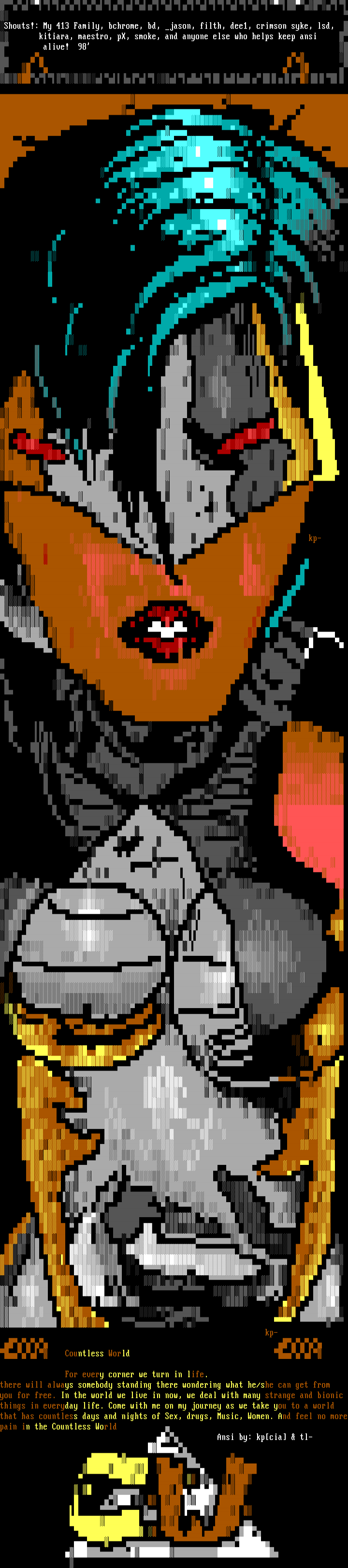 Shouts!: My 413 Family, bchrome, bd, jason, filth, dee1, crimson syke, lsd, kitiara, maestro, pX, smoke, and anyone else who helps keep ansi alive! 98