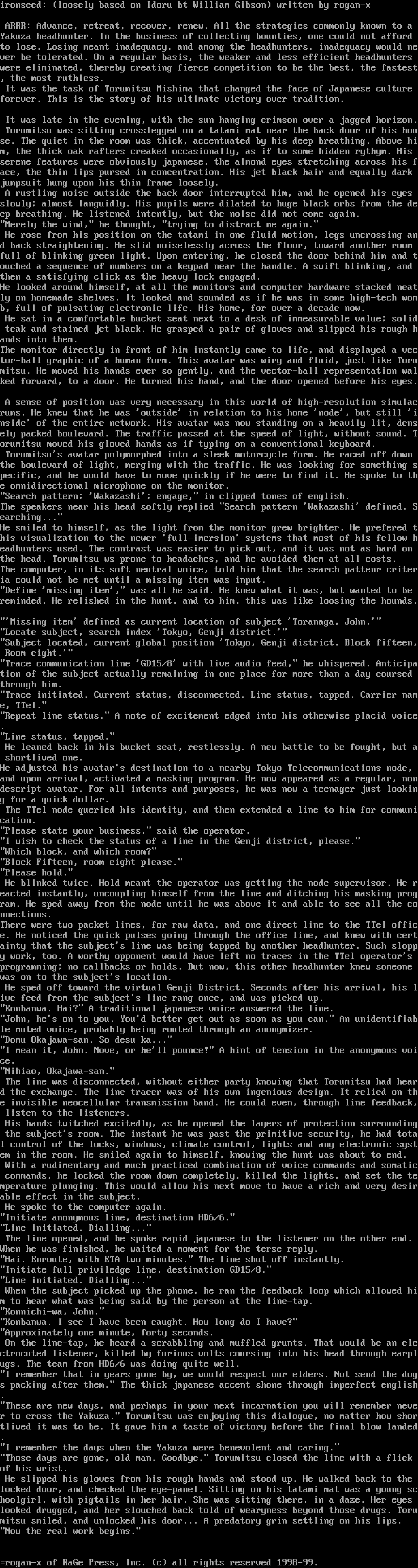 He smiled to himself, as the light from the monitor grew brighter. He prefered this visualization to the newer full-imersion systems that most of his fellow headhunters used. The contrast was easier to pick out, and it was not as hard on the head. Torumitsu ws prone to headaches, and he avoided them at all costs.