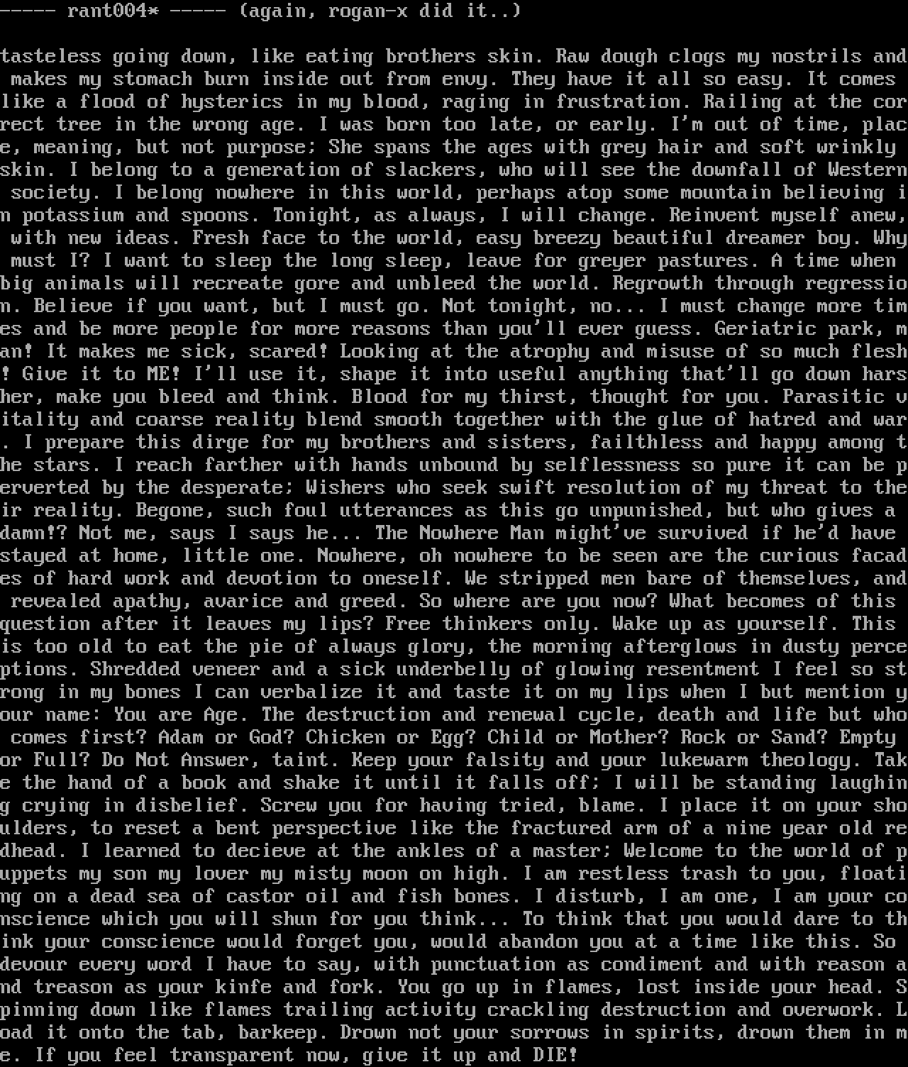 tasteless going down, like eating brothers skin. Raw dough clogs my nostrils and makes my stomach burn inside out from envy. They have it all so easy. It comes like a flood of hysterics in my blood, raging in frustration. Railing at the correct tree in the wrong age. I was born too late, or early. Im out of time, place, meaning, but not purpose She spans the ages with grey hair and soft wrinkly skin. I belong to a generation of slackers, who will see the downfall of Western society. I belong nowhere in this world, perhaps atop some mountain believing in potassium and spoons. Tonight, as always, I will change. Reinvent myself anew, with new ideas. Fresh face to the world, easy breezy beautiful dreamer boy. Why must I? I want to sleep the long sleep, leave for greyer pastures. A time when big animals will recreate gore and unbleed the world. Regrowth through regression. Believe if you want, but I must go. Not tonight, no... I must change more times and be more people for more reasons than youll ever guess. Geriatric park, man! It makes me sick, scared! Looking at the atrophy and misuse of so much flesh! Give it to ME! Ill use it, shape it into useful anything thatll go down harsher, make you bleed and think. Blood for my thirst, thought for you. Parasitic vitality and coarse reality blend smooth together with the glue of hatred and war. I prepare this dirge for my brothers and sisters, failthless and happy among the stars. I reach farther with hands unbound by selflessness so pure it can be perverted by the desperate Wishers who seek swift resolution of my threat to their reality. Begone, such foul utterances as this go unpunished, but who gives a damn!? Not me, says I says he... The Nowhere Man mightve survived if hed have stayed at home, little one. Nowhere, oh nowhere to be seen are the curious facades of hard work and devotion to oneself. We stripped men bare of themselves, and revealed apathy, avarice and greed. So where are you now? What becomes of this question after it leaves my lips? Free thinkers only. Wake up as yourself. This is too old to eat the pie of always glory, the morning afterglows in dusty perceptions. Shredded veneer and a sick underbelly of glowing resentment I feel so strong in my bones I can verbalize it and taste it on my lips when I but mention your name: You are Age. The destruction and renewal cycle, death and life but who comes first? Adam or God? Chicken or Egg? Child or Mother? Rock or Sand? Empty or Full? Do Not Answer, taint. Keep your falsity and your lukewarm theology. Take the hand of a book and shake it until it falls off I will be standing laughing crying in disbelief. Screw you for having tried, blame. I place it on your shoulders, to reset a bent perspective like the fractured arm of a nine year old redhead. I learned to decieve at the ankles of a master Welcome to the world of puppets my son my lover my misty moon on high. I am restless trash to you, floating on a dead sea of castor oil and fish bones. I disturb, I am one, I am your conscience which you will shun for you think... To think that you would dare to think your conscience would forget you, would abandon you at a time like this. So devour every word I have to say, with punctuation as condiment and with reason and treason as your kinfe and fork. You go up in flames, lost inside your head. Spinning down like flames trailing activity crackling destruction and overwork. Load it onto the tab, barkeep. Drown not your sorrows in spirits, drown them in me. If you feel transparent now, give it up and DIE!