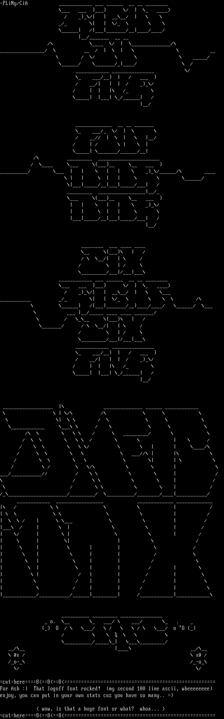 For Ash : That logoff font rocked! my second 100 line ascii, wheeeeeeee