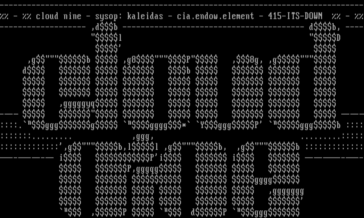 -------------------------------------------------------------------------------- - cloud nine - sysop: kaleidas - cia.endow.element - 415-ITS-DOWN - ------------------- ,db ---------------------------------------- db, ---- l D