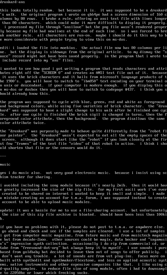 this looks totally random. but because it is. it was supposed to be a drunkards walk. the original program i wrote on qb64pe had a screen dimension of 160 columns by 80 rows. i broke a rule, offering an ansi text file with lines longer than 80 characters. which could make it more difficult to display it properly. i processed my file through ansilove but the png file wasnt rendered properly because my file had newlines at the end of each line. so i was forced to break another rule. all characters are run-on. maybe i should do it this way to be more considerate with people trying to view this on ms-dos.