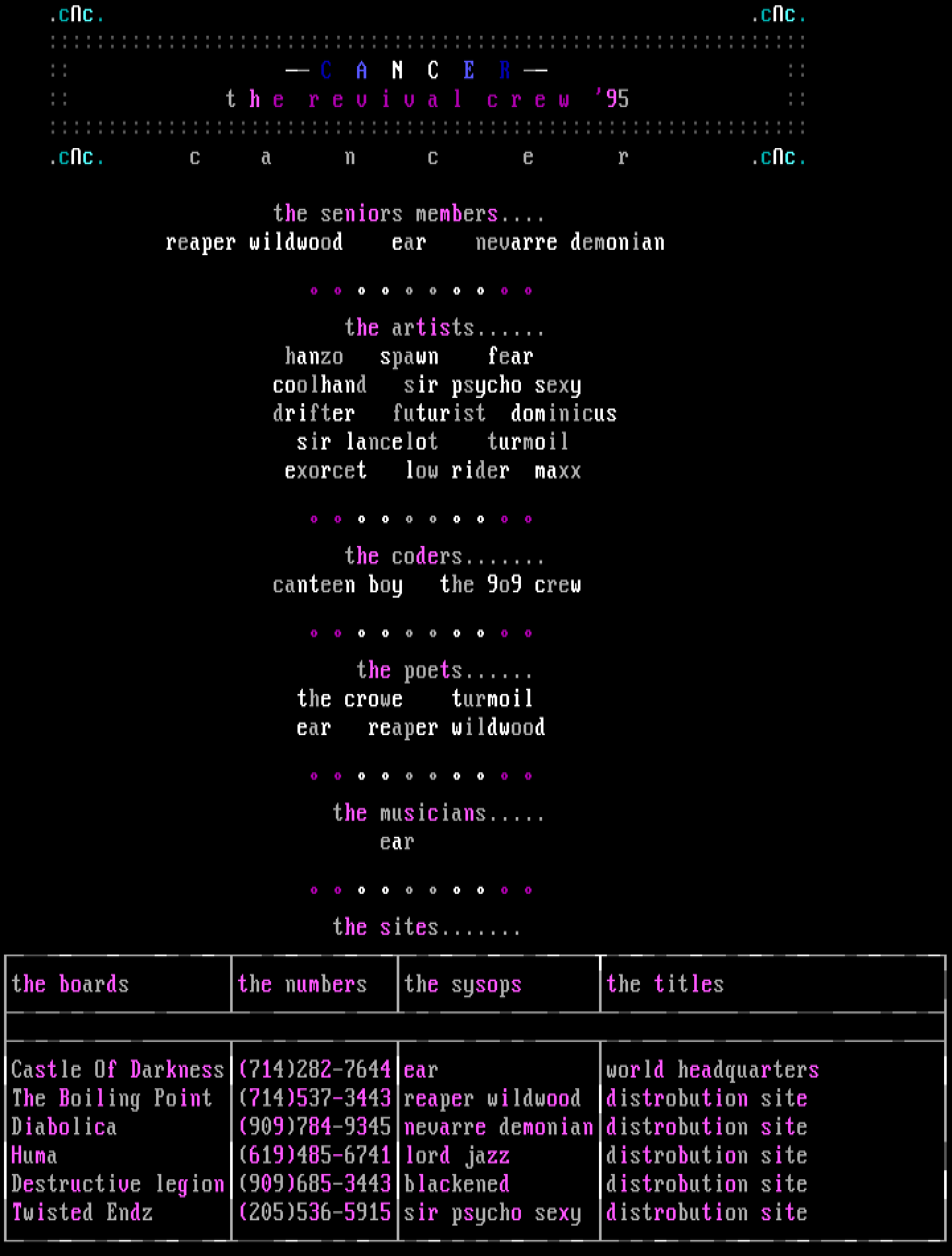 the boards the numbers the sysops the titles Castle Of Darkness714282-7644ear world headquarters The Boiling Point 714537-3443reaper wildwood distrobution site Diabolica 909784-9345nevarre demoniandistrobution site Huma 619485-6741lord jazz distrobution site Destructive legion909685-3443blackened distrobution site Twisted Endz 205536-5915sir psycho sexy distrobution site