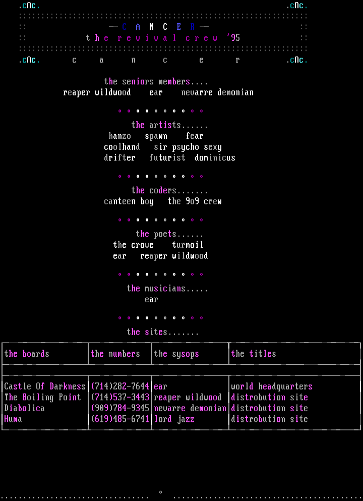 the boards the numbers the sysops the titles Castle Of Darkness714282-7644ear world headquarters The Boiling Point 714537-3443reaper wildwood distrobution site Diabolica 909784-9345nevarre demoniandistrobution site Huma 619485-6741lord jazz distrobution site