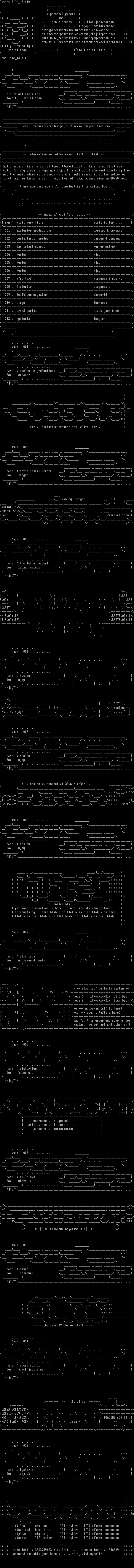 / -+ index of asciis in colly +- /.----------------------------------------------------------------------------. num :: ascii work title ascii is for .... ---------------------------------------------------------------------------- 001 :: exclusive productions creator company ------------------------------------------------------------------------------/ 002 :: serial!ascii header sargon company ------------------------------------------------------------------------------/ 003 :: the lethal aspect xypher matryx ------------------------------------------------------------------------------/ 004 :: moslem mjay ------------------------------------------------------------------------------/ 005 :: moslem mjay ------------------------------------------------------------------------------/ 006 :: moslem mjay ------------------------------------------------------------------------------/ 007 :: afro turf mirroman cool-t ------------------------------------------------------------------------------/ 008 :: distortion biogenesis ------------------------------------------------------------------------------/ 009 :: fullblown magazine whore-id ------------------------------------------------------------------------------/ 010 :: singe unknown ------------------------------------------------------------------------------/ 011 :: creed script black jack me ------------------------------------------------------------------------------/ 012 :: hysteria icepick ------------------------------------------------------------------------------/ / / // /