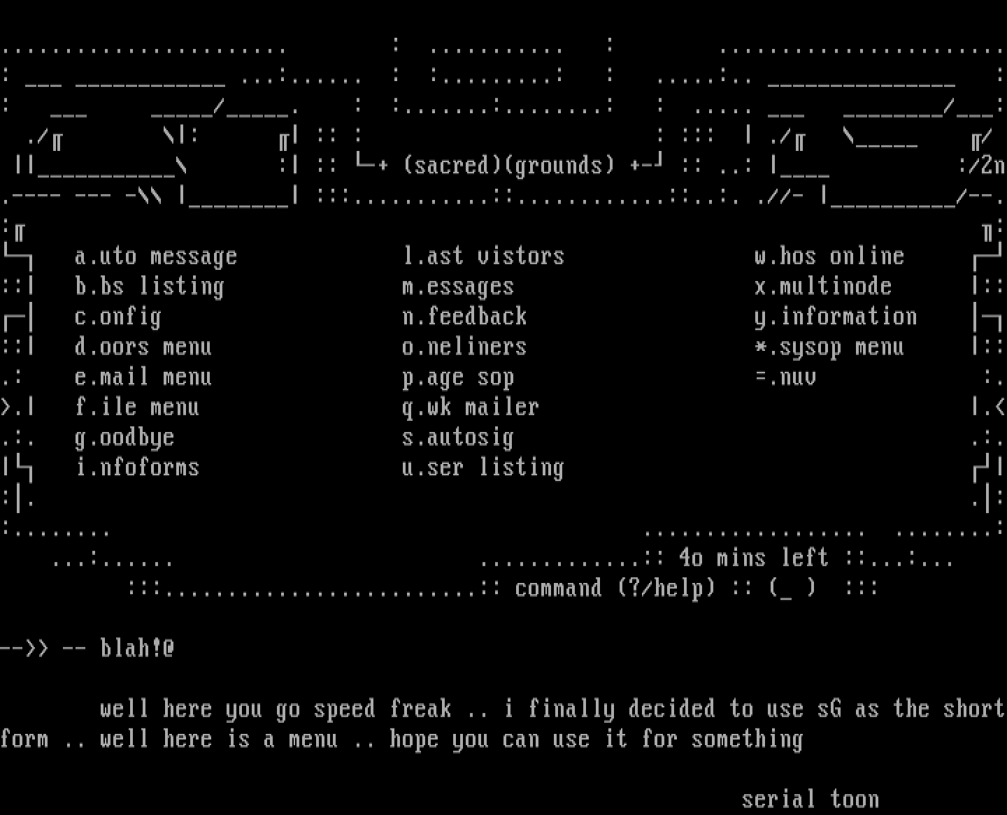 : :: -+ sacredgrounds +- :: ..: :/2n.---- --- - :::...........::............::..:. .//- /--.: : a.uto message l.ast vistors w.hos online :: b.bs listing m.essages x.multinode :: c.onfig n.feedback y.information :: d.oors menu o.neliners *.sysop menu ::.: e.mail menu p.age sop .nuv :.. f.ile menu q.wk mailer ..:. g.oodbye s.autosig .:. i.nfoforms u.ser listing :. .::........ .................. ........: ...:...... .............:: 4o mins left ::...:...