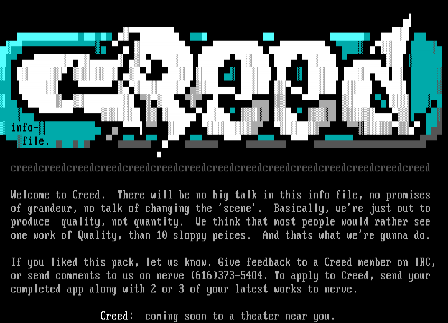 Welcome to Creed. There will be no big talk in this info file, no promises