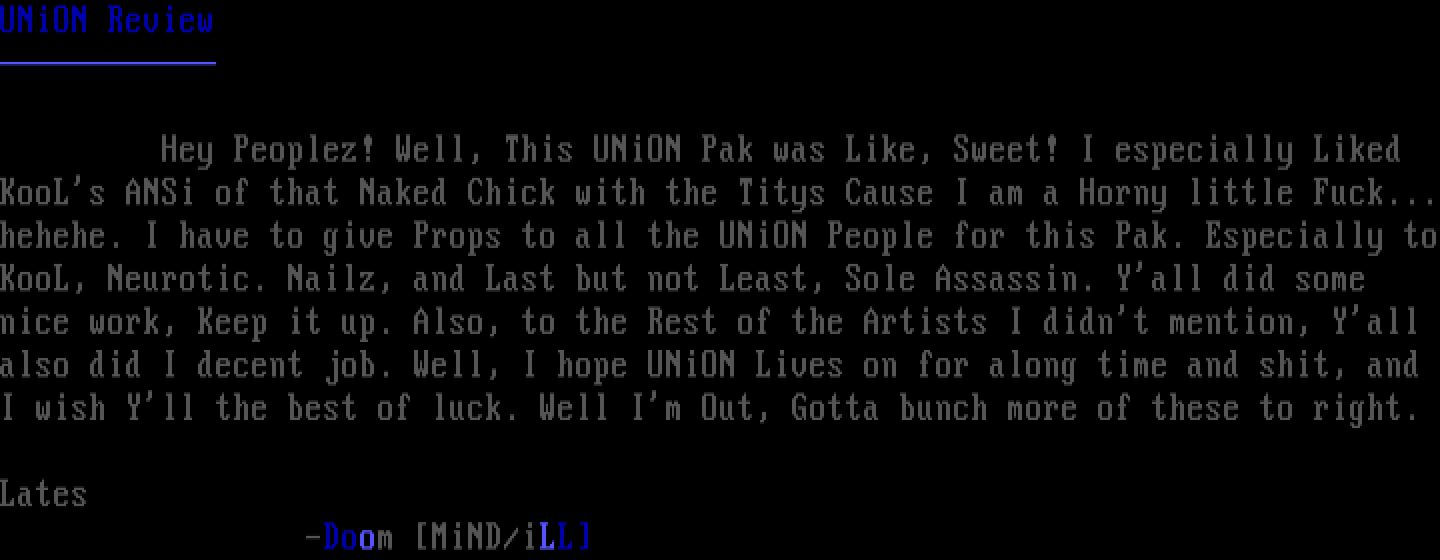 UNiON Review Hey Peoplez! Well, This UNiON Pak was Like, Sweet! I especially LikedKooLs ANSi of that Naked Chick with the Titys Cause I am a Horny little Fuck...hehehe. I have
