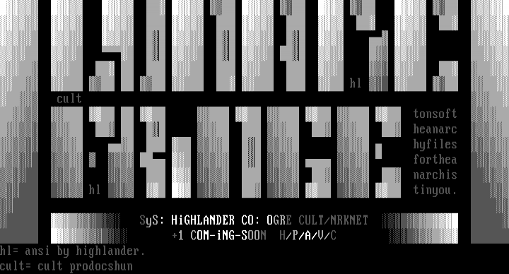 hl cult tonsoft heanarc hyfiles forthea narchis hl tinyou. SyS: HiGHLANDER CO: OGRE CULT/NRKNET +1 COM-iNG-SOON H/P/A/V/C hl ansi by highlander.