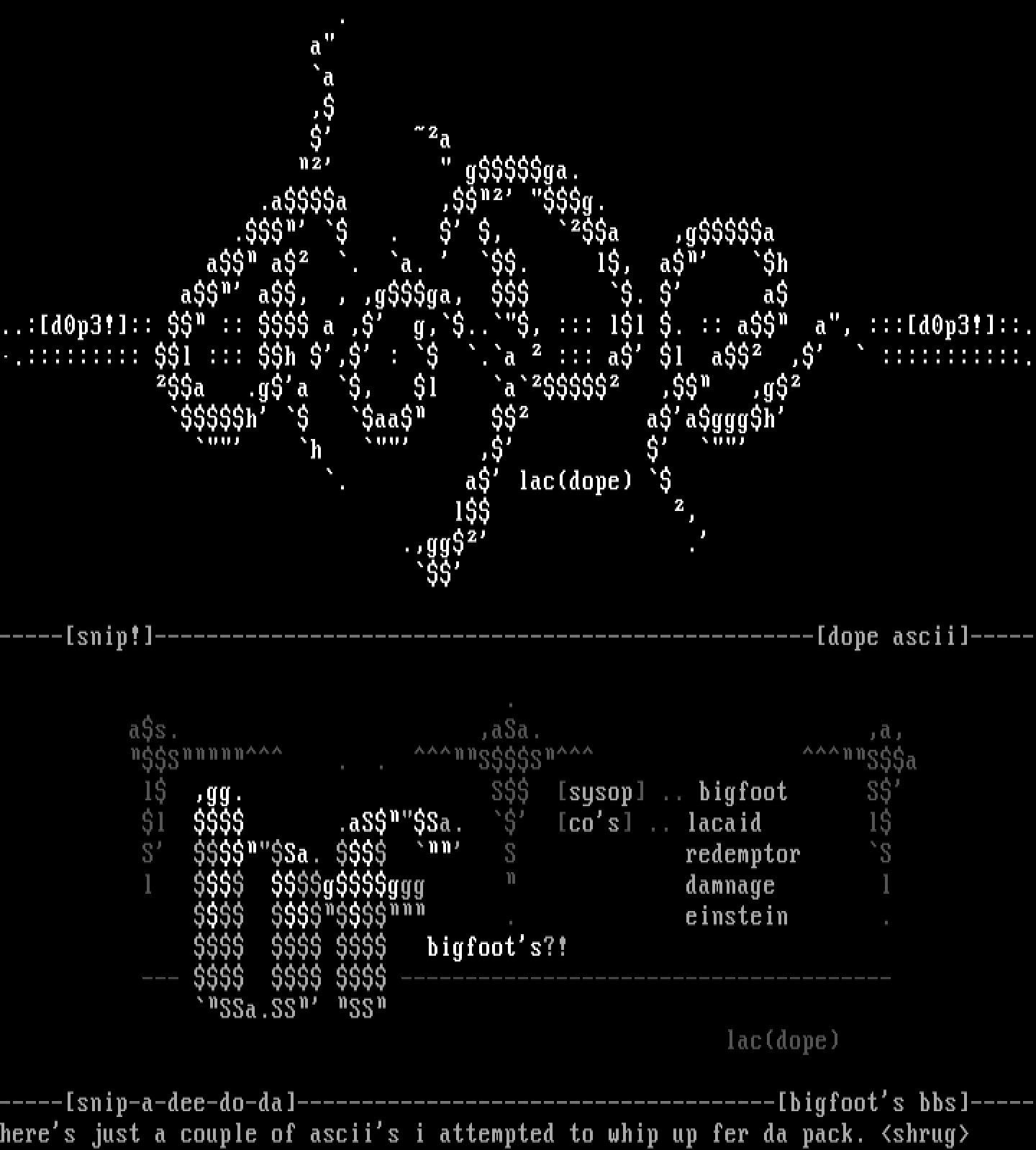 -----snip-a-dee-do-da-------------------------------------bigfoots bbs-----heres just a couple of asciis i attempted to whip up fer da pack. shrug