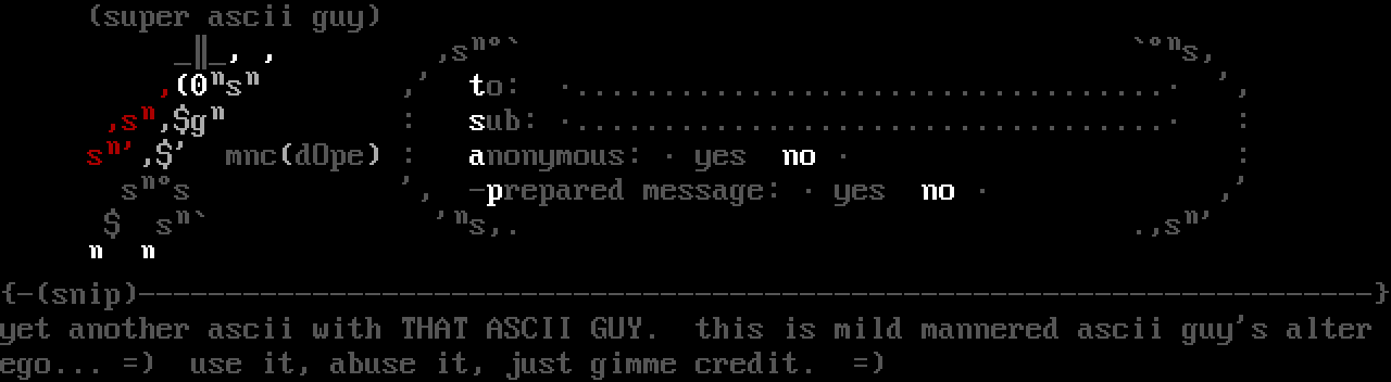 -snip-----------------------------------------------------------------------yet another ascii with THAT ASCII GUY. this is mild mannered ascii guys alter