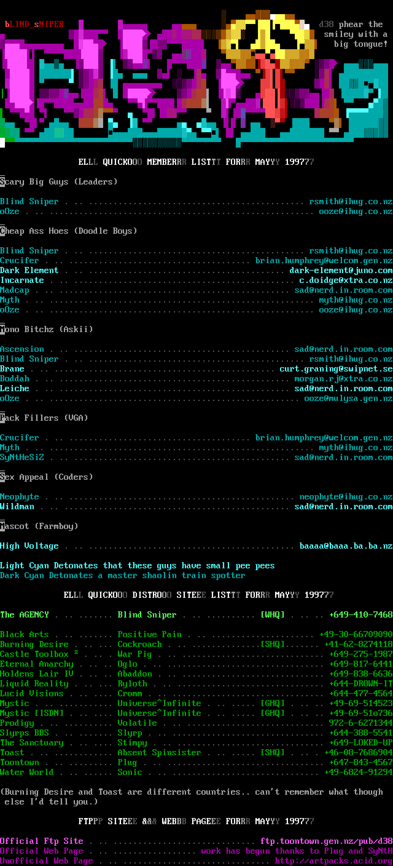 Blind Sniper . .. ............................................ rsmith@ihug.co.nzCrucifer . .. ..................................... brian.humphrey@welcom.gen.nzDark Element . .. ........................................ dark-element@juno.comIncarnate . .. ............................................. c.doidge@xtra.co.nzMadcap . .. ............................................... sad@nerd.in.room.comMyth . .. ...................................................... myth@ihug.co.nzoOze . .. ...................................................... ooze@ihug.co.nz