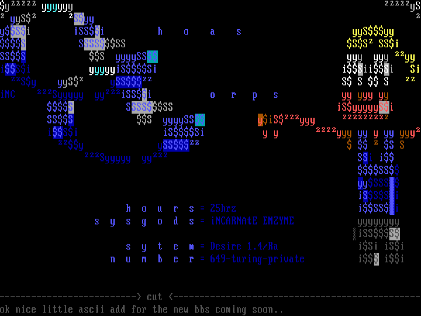 -------------------------- cut -----------------------------------------------ok nice little ascii add for the new bbs coming soon..