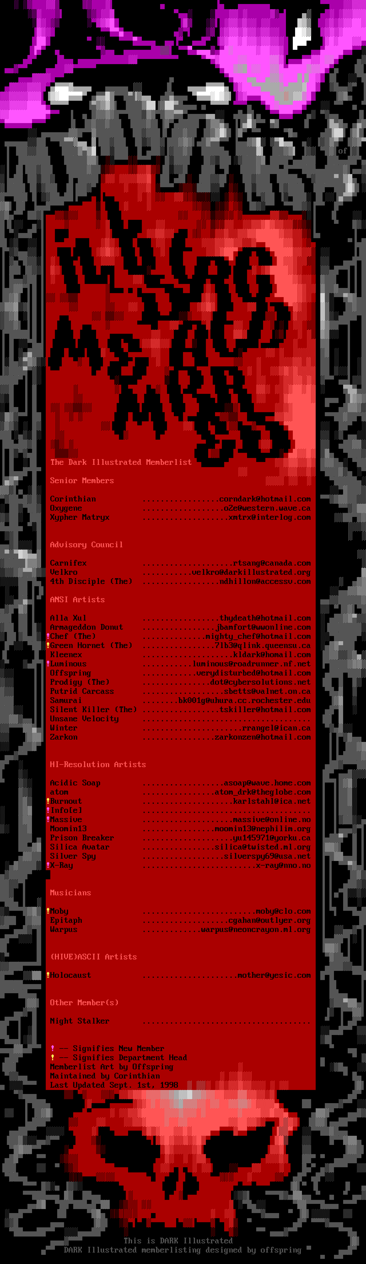 !Moby .........................moby@clo.com Epitaph ...................cgahan@outlyer.org Warpus .............warpus@neoncrayon.ml.org HIVEASCII Artists !Holocaust .....................mother@yesic.com Other Members Night Stalker ..................................... ! -- Signifies New Member ! -- Signifies Department Head Memberlist Art by Offspring Maintained by Corinthian