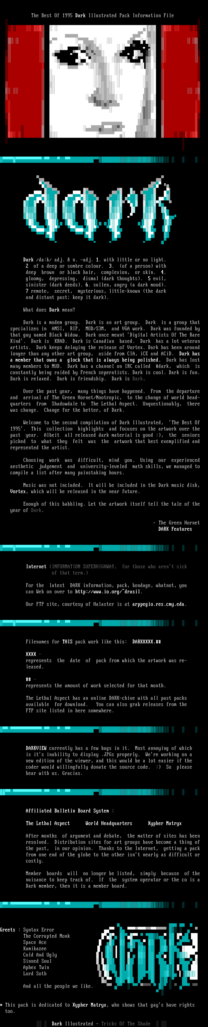 specializes in ANSI, RIP, MOD/S3M, andVGA work. Dark was founded by