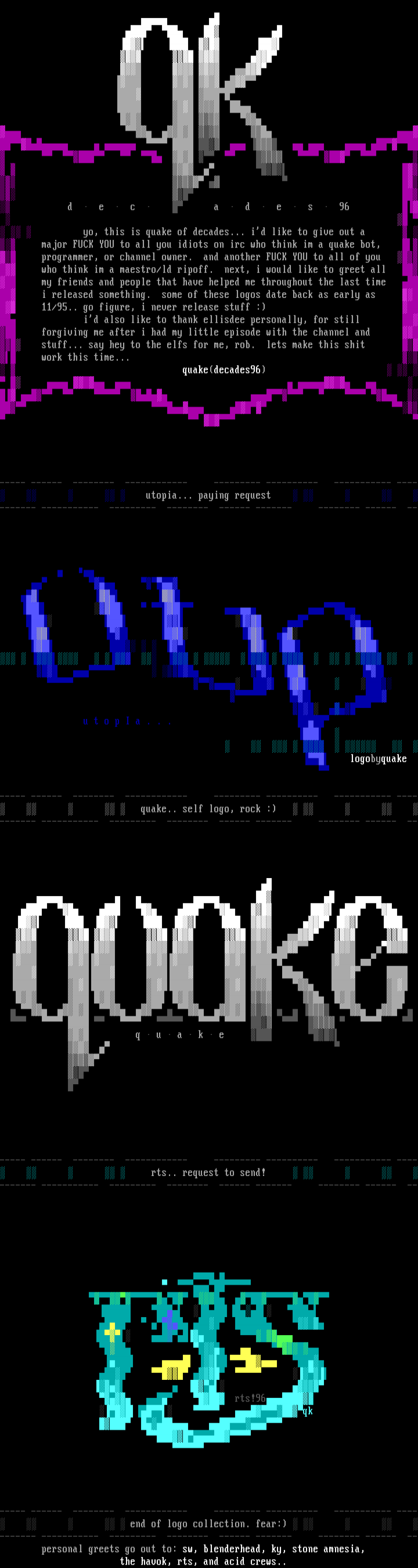 yo, this is quake of decades... id like to give out a major FUCK YOU to all you idiots on irc who think im a quake bot, programmer, or channel owner. and another FUCK YOU to all of you who think im a maestro/ld ripoff. next, i would like to greet all my friends and people that have helped me throughout the last time i released something. some of these logos date back as early as 11/95.. go figure, i never release stuff : id also like to thank ellisdee personally, for still