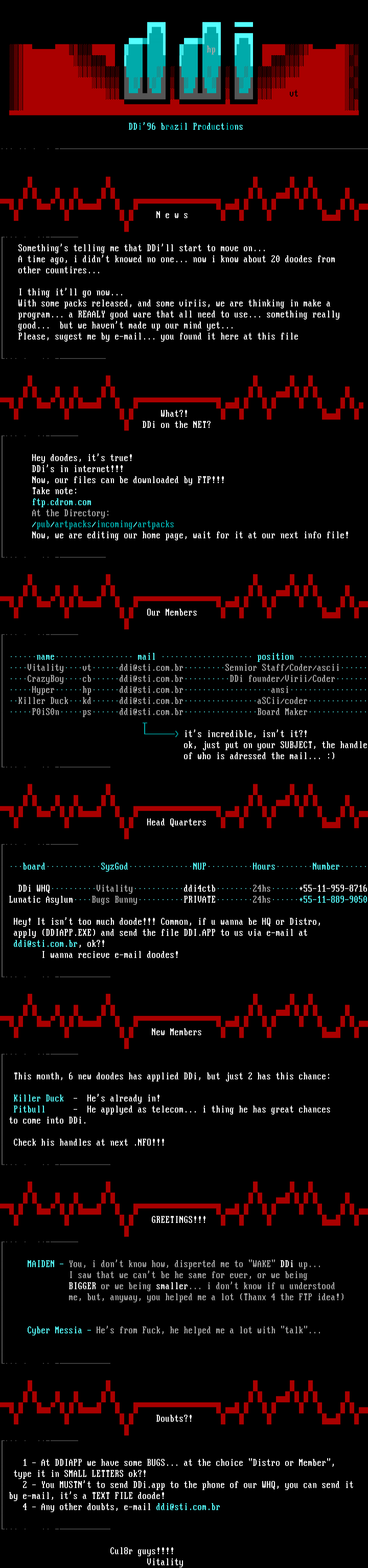 name mail position Vitalityvtddi@sti.com.brSennior Staff/Coder/ascii CrazyBoycbddi@sti.com.brDDi founder/Virii/Coder Hyperhpddi@sti.com.bransi Killer Duckkdddi@sti.com.braSCii/coder P0iS0npsddi@sti.com.brBoard Maker