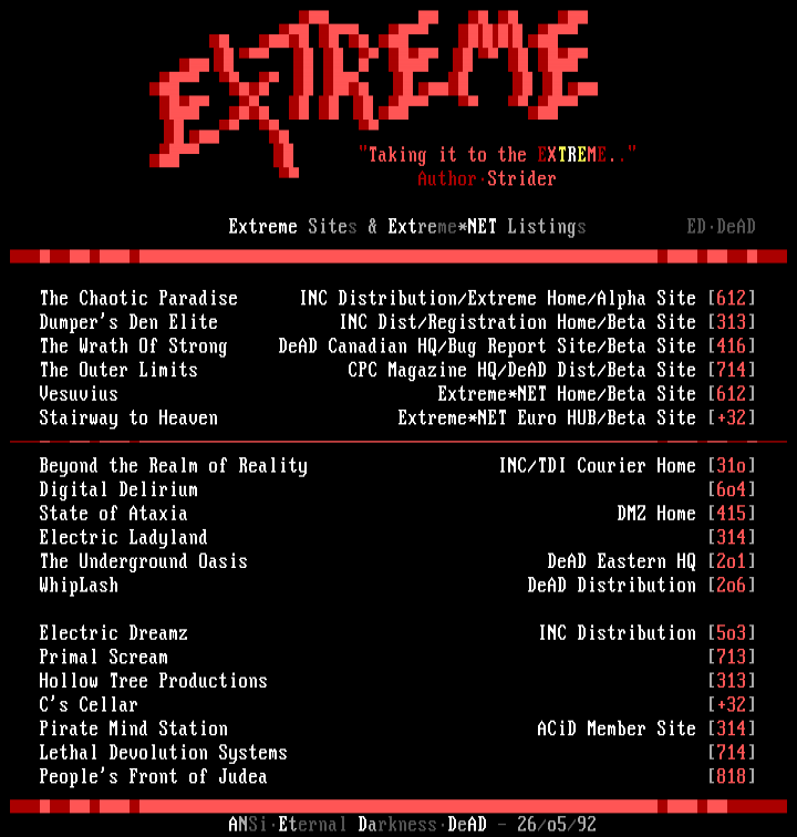 The Wrath Of Strong DeAD Canadian HQ/Bug Report Site/Beta Site 416 The Outer Limits CPC Magazine HQ/DeAD Dist/Beta Site 714 Vesuvius Extreme*NET Home/Beta Site