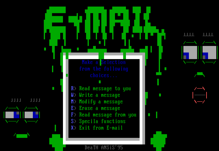 MakeaSelection fromthefollowing choices... RReadmessagetoyou WWriteamessage MModifyamessage / / EEraseamessage FReadmessagefromyou / / SSpecilafunctions XExitfromE-mail / DeaTHANSiS95 // / /