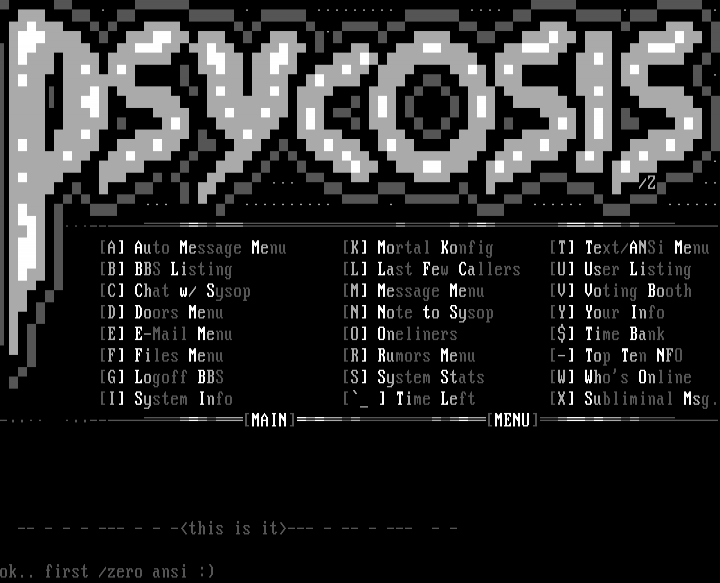 C Chat w/ Sysop M Message Menu V Voting Booth D Doors Menu N Note to Sysop Y Your Info E E-Mail Menu O Oneliners Time Bank F Files Menu R Rumors Menu - Top Ten NFO