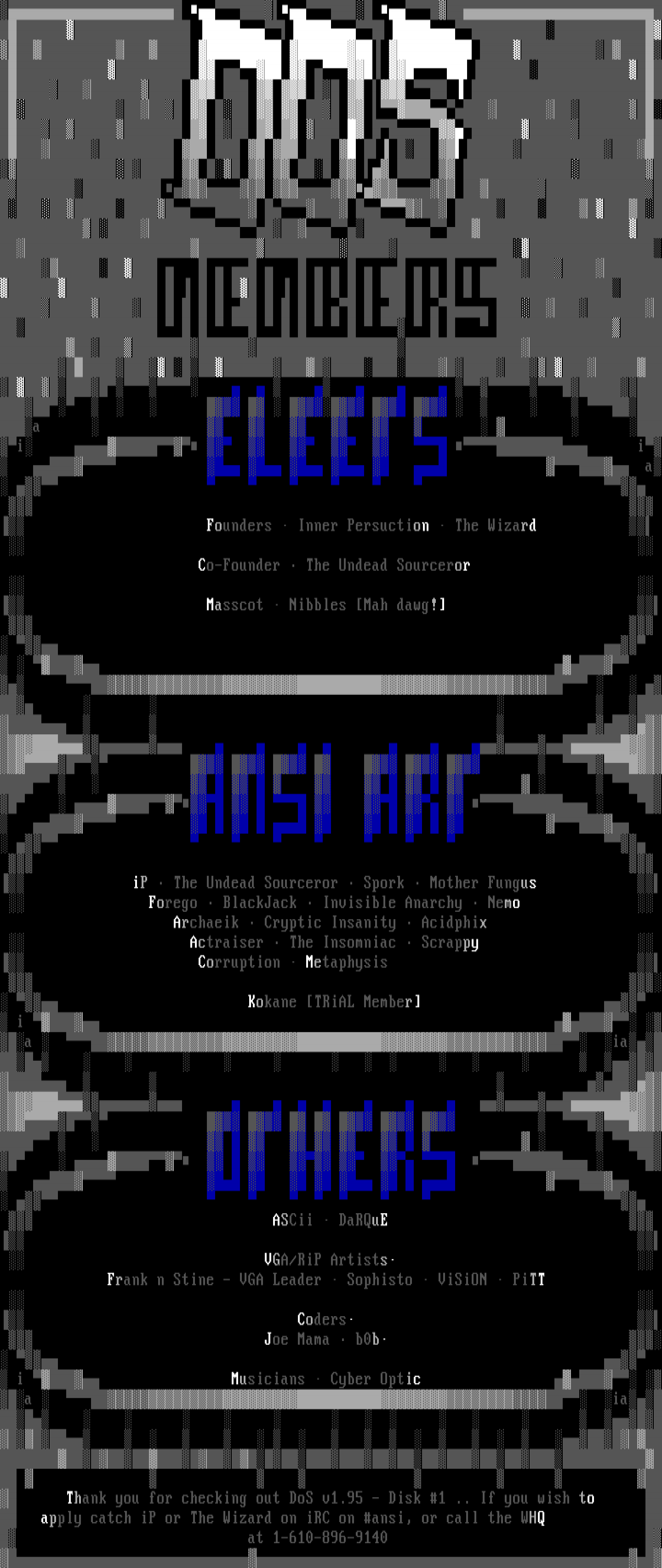 i Musicians Cyber Optic a ia Thank you for checking out DoS v1.95 - Disk 1 .. If you wish to apply catch iP or The Wizard on iRC on ansi, or call the WHQ at 1-610-896-9140