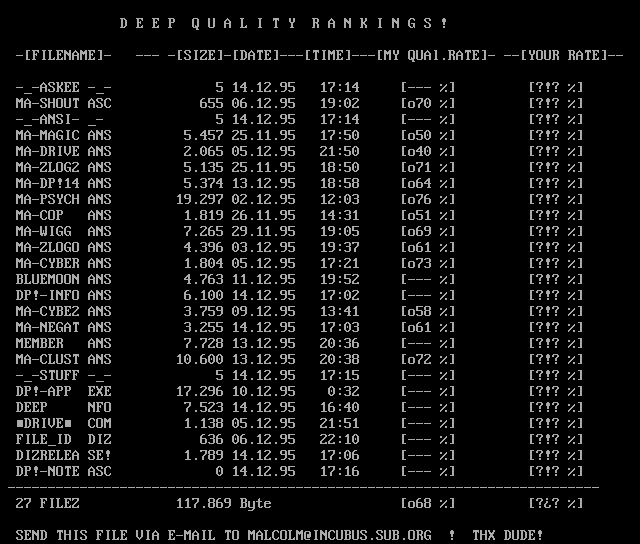 SEND THIS FILE VIA E-MAIL TO MALCOLM@INCUBUS.SUB.ORG ! THX DUDE!