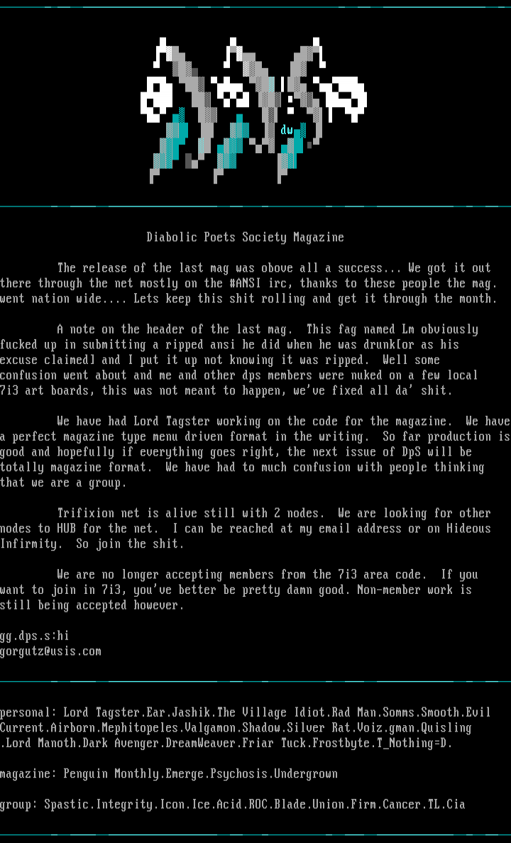 there through the net mostly on the ANSI irc, thanks to these people the mag.