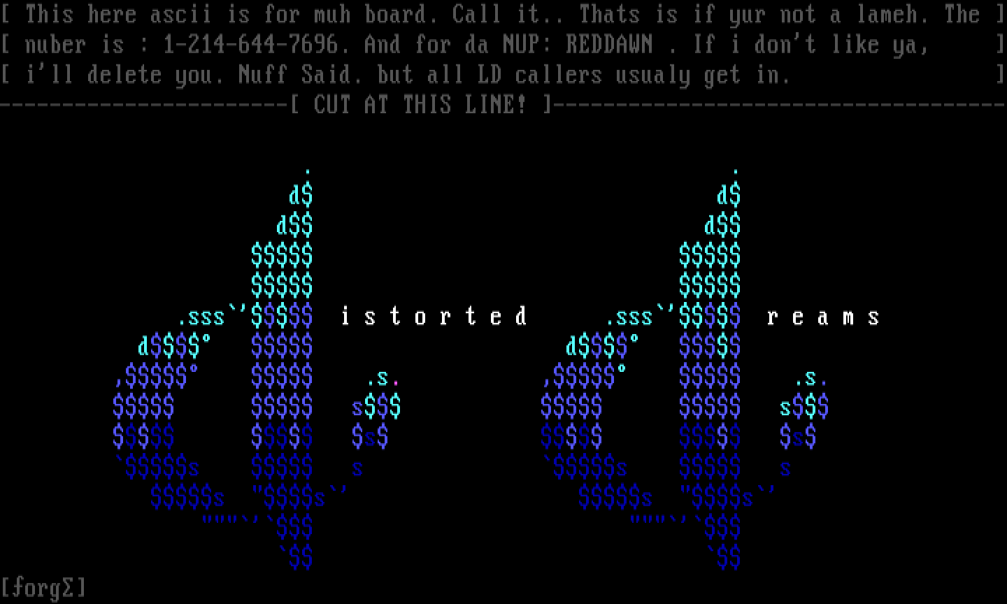 This here ascii is for muh board. Call it.. Thats is if yur not a lameh. The nuber is : 1-214-644-7696. And for da NUP: REDDAWN . If i dont like ya, ill delete you. Nuff Said. but all LD callers usualy get in. ----------------------- CUT AT THIS LINE! ------------------------------------