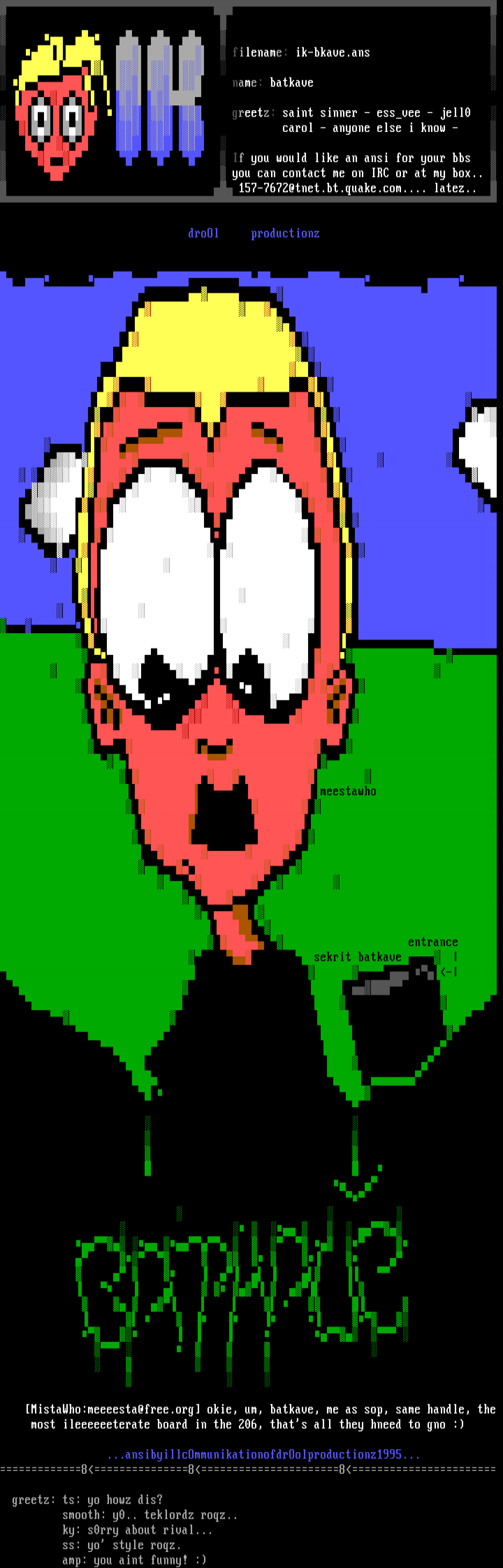 greetz: saint sinner - essvee - jell0 carol - anyone else i know - If you would like an ansi for your bbs you can contact me on IRC or at my box.. 157-7672@tnet.bt.quake.com.... latez..