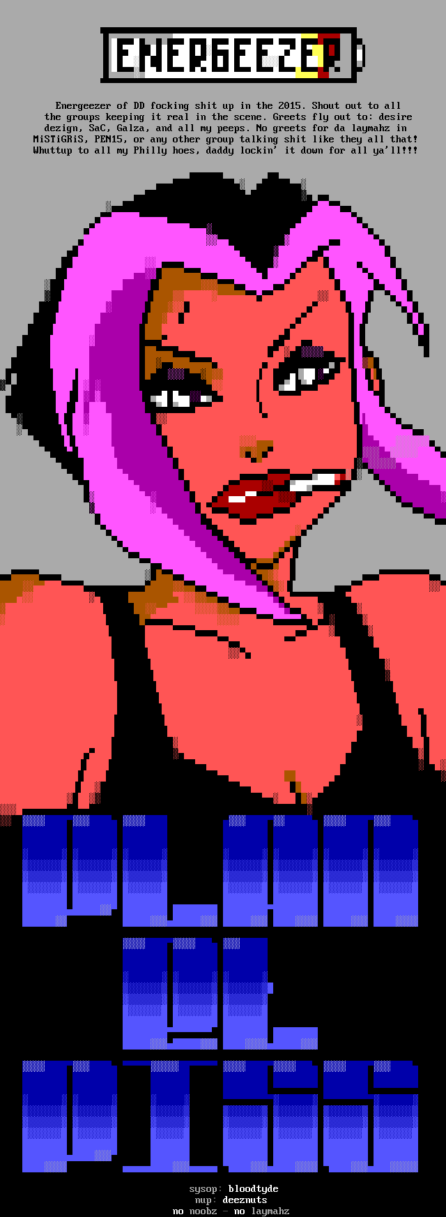 Energeezer of DD focking shit up in the 2015. Shout out to all the groups keeping it real in the scene. Greets fly out to: desire dezign, SaC, Galza, and all my peeps. No greets for da laymahz inMiSTiGRiS, PEN15, or any other group talking shit like they all that! Whuttup to all my Philly hoes, daddy lockin it down for all yall!!!