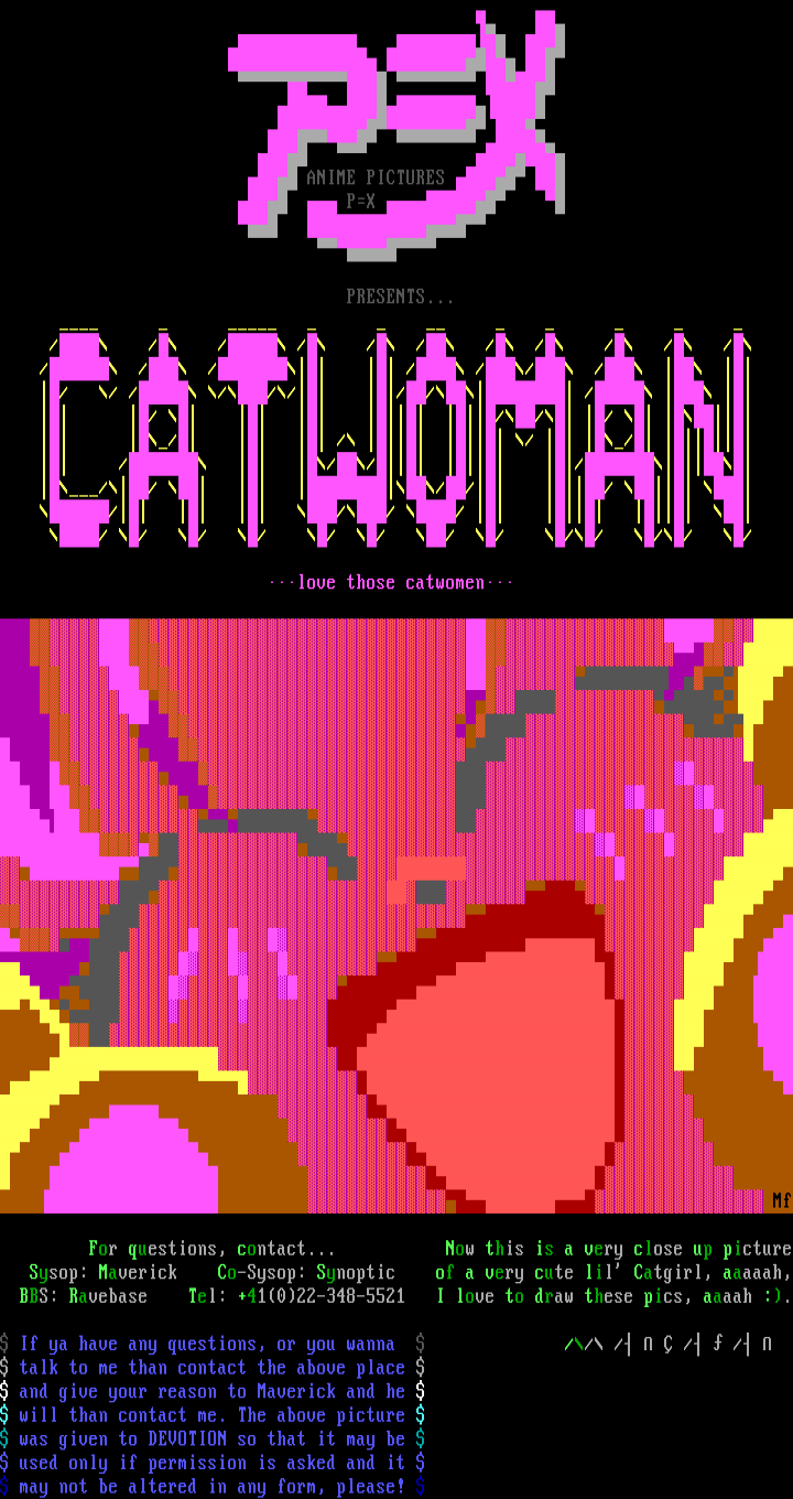 For questions, contact... Now this is a very close up picture Sysop: Maverick Co-Sysop: Synoptic of a very cute lil Catgirl, aaaaah, BBS: Ravebase Tel: +41022-348-5521 I love to draw these pics, aaaah :.