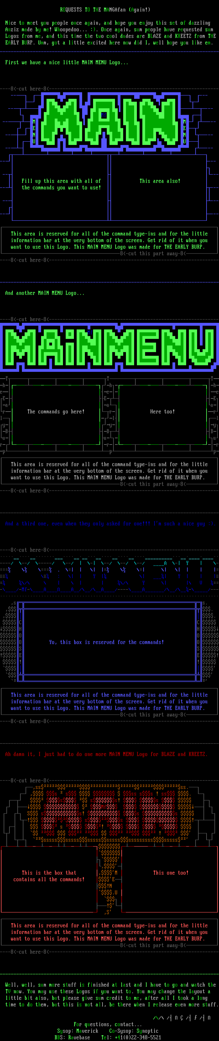 This area is reserved for all of the command type-ins and for the little information bar at the very bottom of the screen. Get rid of it when you want to use this Logo. This MAIN MENU Logo was made for THE EARLY BURP. -8-cut this part away-8----8-cut here-8--------------------------------------------------------------