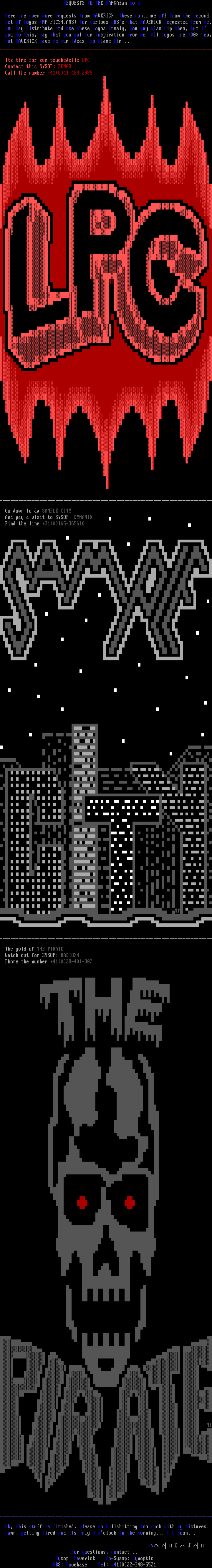 set of Logos MF-PICS4.ANS for various BBSs that MAVERICK requested from me. You may distribute and use these logos freely, you may also rip them, but if