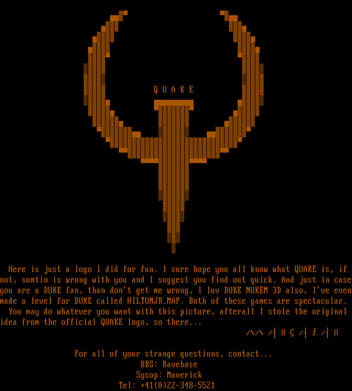 Here is just a logo I did for fun. I sure hope you all know what QUAKE is, if not, sumtin is wrong with you and I suggest you find out quick. And just in caseyou are a DUKE fan, than dont get me wrong, I luv DUKE NUKEM 3D also, Ive evenmade a level for DUKE called HILTONJR.MAP. Both of these games are spectacular.