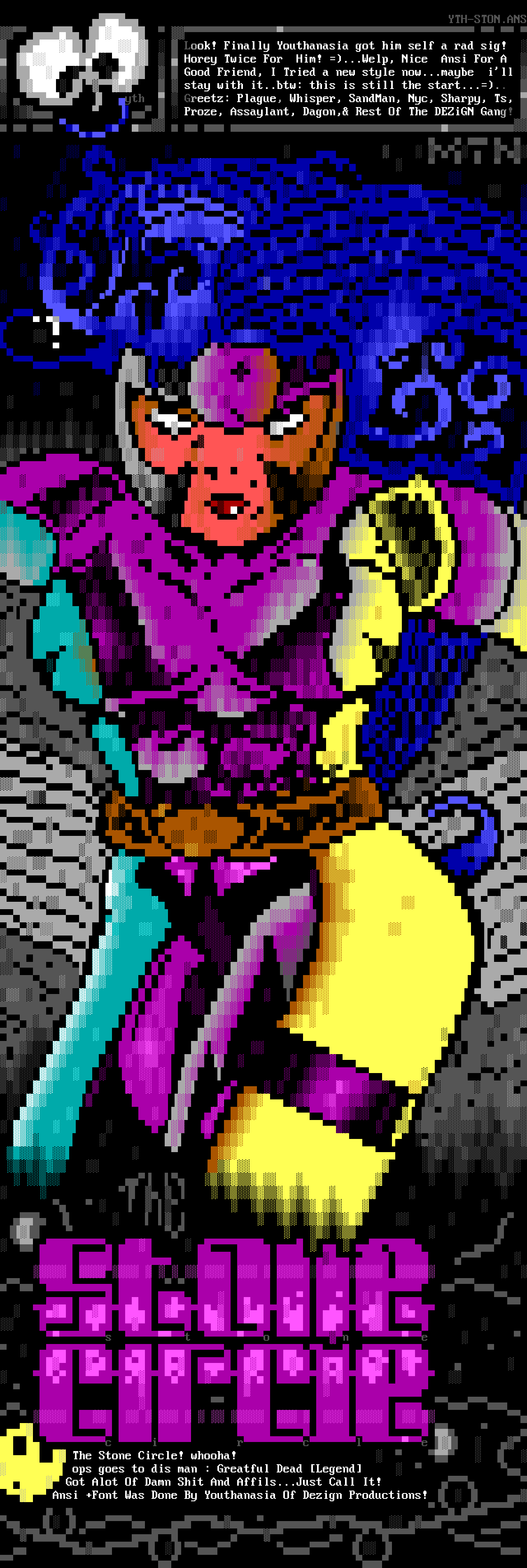 YTH-STON.ANS Look! Finally Youthanasia got him self a rad sig! Horey Twice For Him! ...Welp, Nice Ansi For A Good Friend, I Tried a new style now...maybe ill stay with it..btw: this is still the start..... yth Greetz: Plague, Whisper, SandMan, Nyc, Sharpy, Ts,
