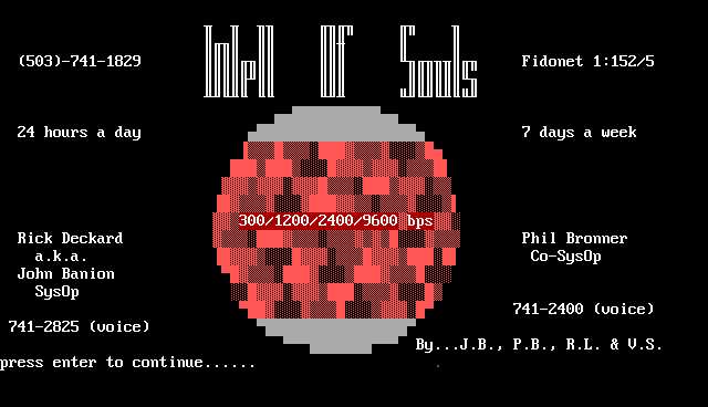 John BanionSysOp741-2825 voicePhil BronnerCo-SysOp741-2400 voice741-2400 voice By...J.B., P.B., R.L. V.S.press enter to continue......