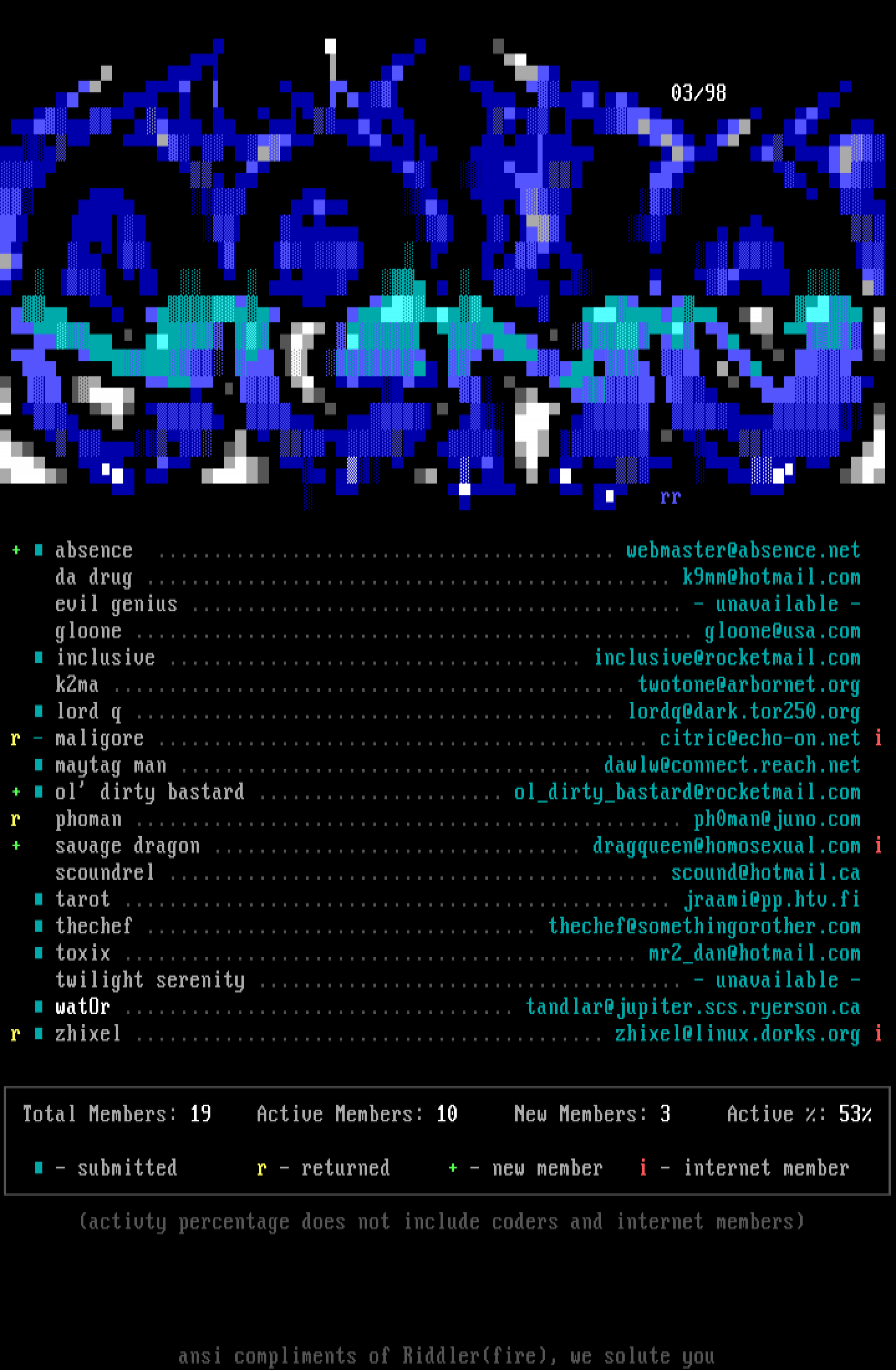 Total Members: 19 Active Members: 10 New Members: 3 Active : 53 xx - submitted r - returned + - new member i - internet member x activty percentage does not include coders and internet members