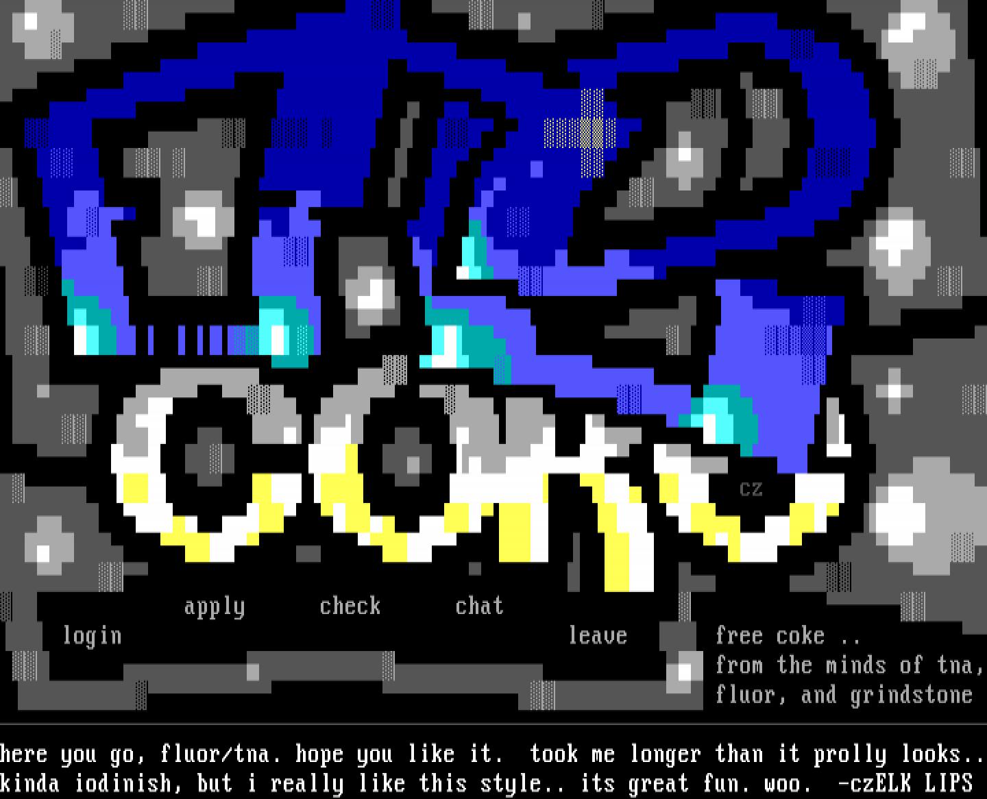 here you go, fluor/tna. hope you like it. took me longer than it prolly looks..kinda iodinish, but i really like this style.. its great fun. woo. -czELK LIPS