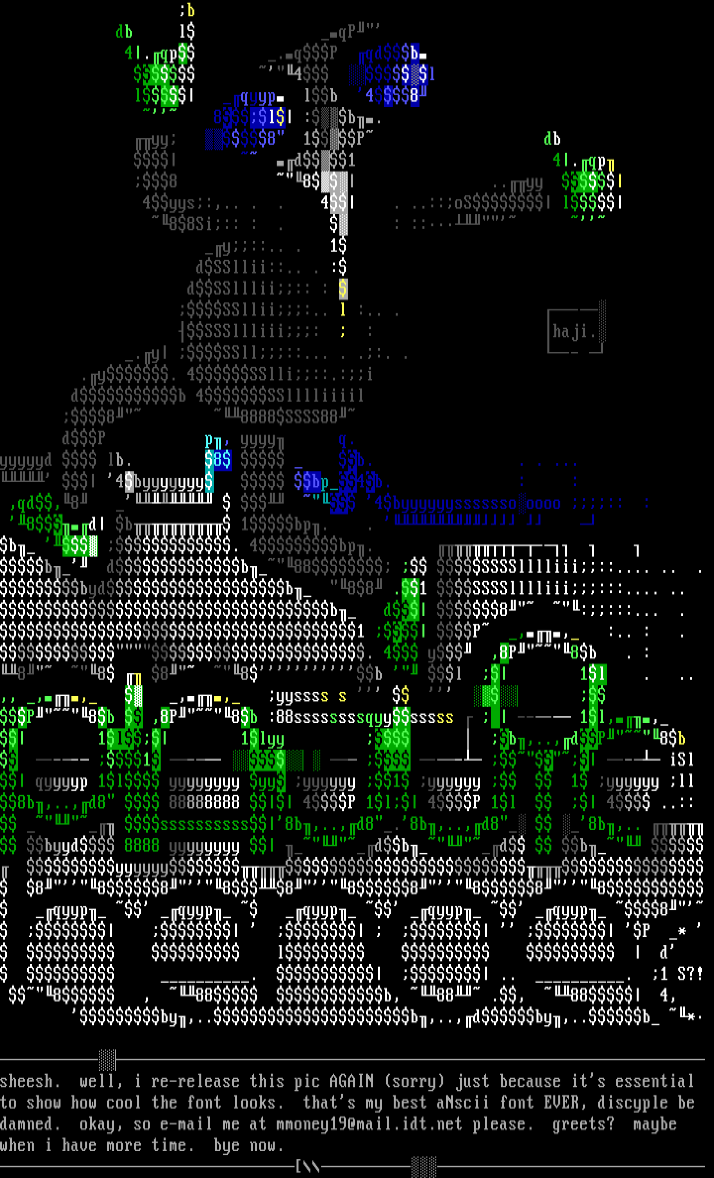 sheesh. well, i re-release this pic AGAIN sorry just because its essential to show how cool the font looks. thats my best aNscii font EVER, discyple be