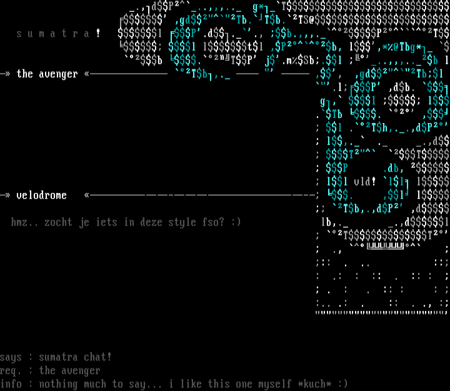 .,dP..,,,.. g*T ,gdTb.Tb.TS@ s u m a t r a ! l P.d.., b.,,,.PT l ltl ,Pb, l,*@Tbg* b .TP j.mSb.l ..,,,..b l the avenger - Tb,. ,, ,gdTbl .lP ,db. g, l l .Tb . , l .Th,..,dP l,. . .,d T T P .db, ll vld! ll l velodrome ---------- . ,l l Tb,.,dP ,d hmz.. zocht je iets in deze style fso? : lb,. .,dl TT ., :: . .. :: : .: : :: . :: : . : . :: : : :.. .: . :: . ., :