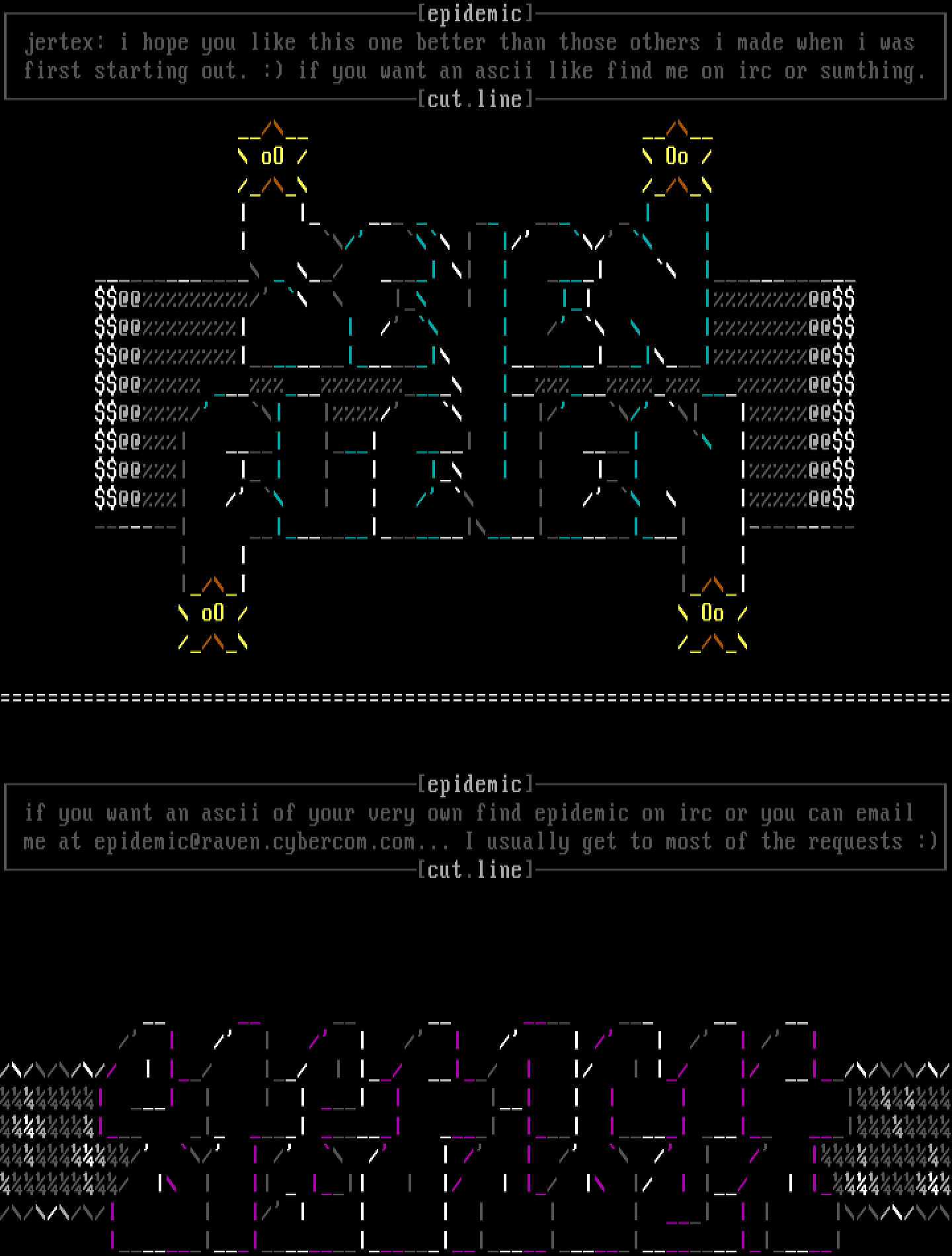 epidemic jertex: i hope you like this one better than those others i made when i was first starting out. : if you want an ascii like find me on irc or sumthing. cut.line / /