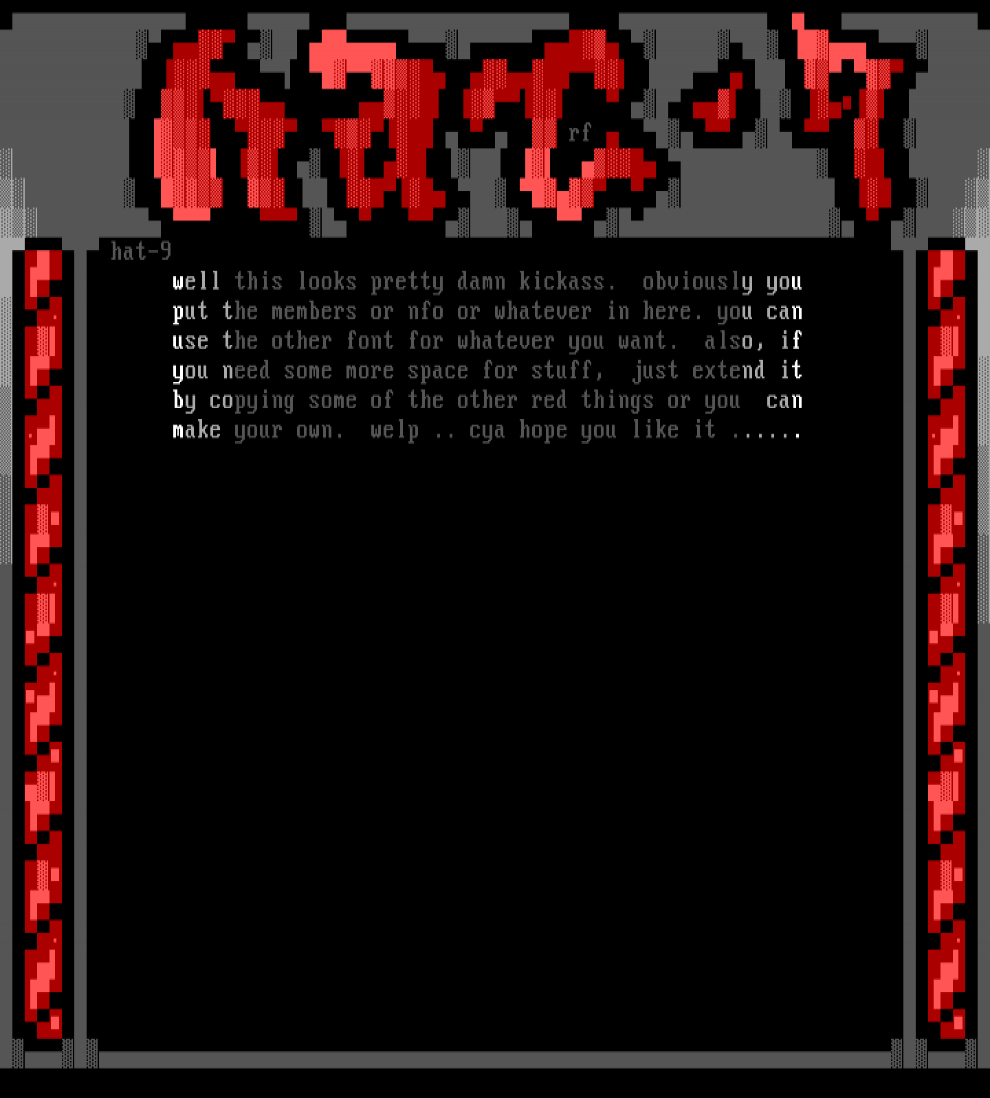 hat-9 well this looks pretty damn kickass. obviously you . put the members or nfo or whatever in here. you can . use the other font for whatever you want. also, if you need some more space for stuff, just extend it