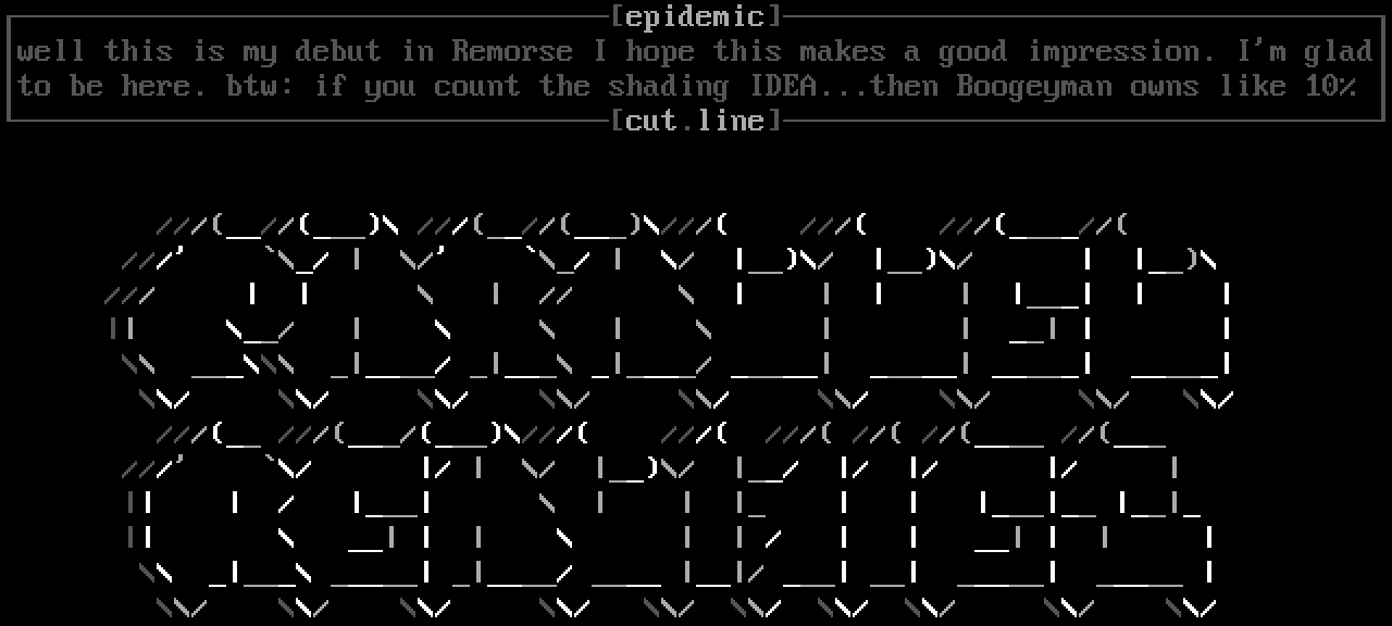 epidemicwell this is my debut in Remorse I hope this makes a good impression. Im gladto be here. btw: if you count the shading IDEA...then Boogeyman owns like 10 cut.line