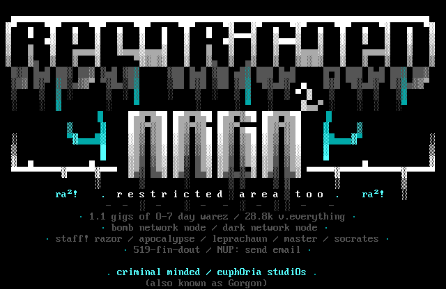 1.1 gigs of O-7 day warez / 28.8k v.everything