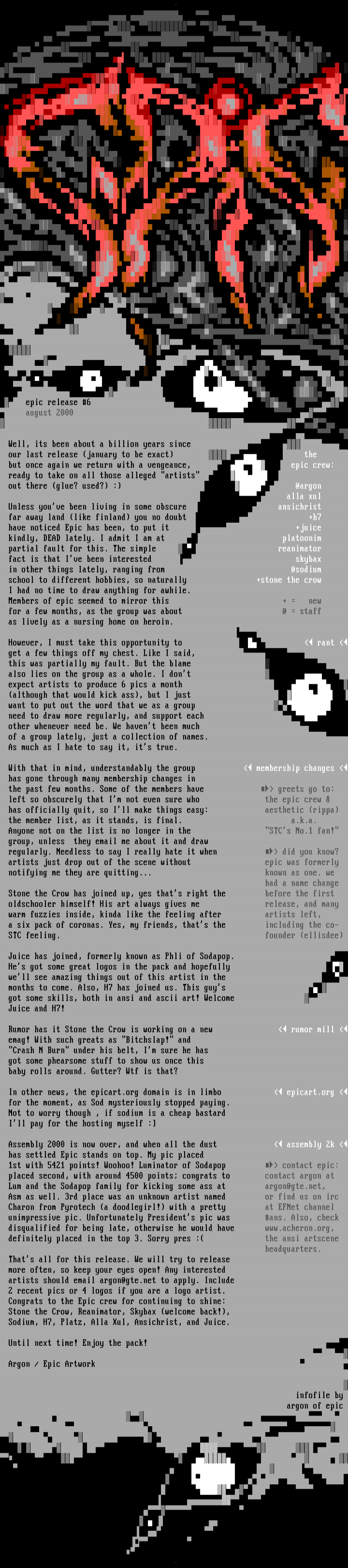 well see amazing things out of this artist in the months to come. Also, H7 has joined us. This guys got some skills, both in ansi and ascii art! Welcome Juice and H7! Rumor has it Stone the Crow is working on a new rumor mill emag! With such greats as Bitchslap! and Crash N Burn under his belt, Im sure he has got some phearsome stuff to show us once this baby rolls around. Gutter? Wtf is that? In other news, the epicart.org domain is in limbo epicart.org for the moment, as Sod mysteriously stopped paying. Not to worry though , if sodium is a cheap bastard Ill pay for the hosting myself : Assembly 2000 is now over, and when all the dust assembly 2k has settled Epic stands on top. My pic placed 1st with 5421 points! Woohoo! Luminator of Sodapop contact epic: placed second, with around 4500 points congrats to contact argon at Lum and the Sodapop family for kicking some ass at argon@gte.net, Asm as well. 3rd place was an unknown artist named or find us on irc Charon from Pyrotech a doodlegirl! with a pretty at EFNet channel unimpressive pic. Unfortunately Presidents pic was ans. Also, check disqualified for being late, otherwise he would have www.acheron.org, definitely placed in the top 3. Sorry pres : the ansi artscene headquarters. Thats all for this release. We will try to release more often, so keep your eyes open! Any interested artists should email argon@gte.net to apply. Include 2 recent pics or 4 logos if you are a logo artist. Congrats to the Epic crew for continuing to shine: Stone the Crow, Reanimator, Skybax welcome back!, Sodium, H7, Platz, Alla Xul, Ansichrist, and Juice. Until next time! Enjoy the pack!