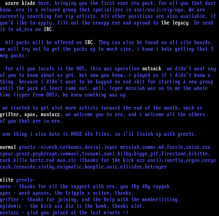 know. era is a relaxed group that specializes in ansi/ascii/rip/vga. We are